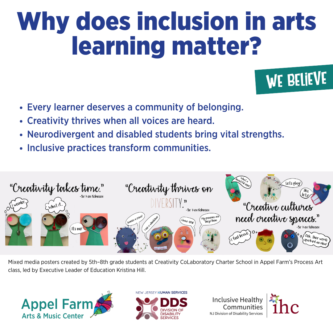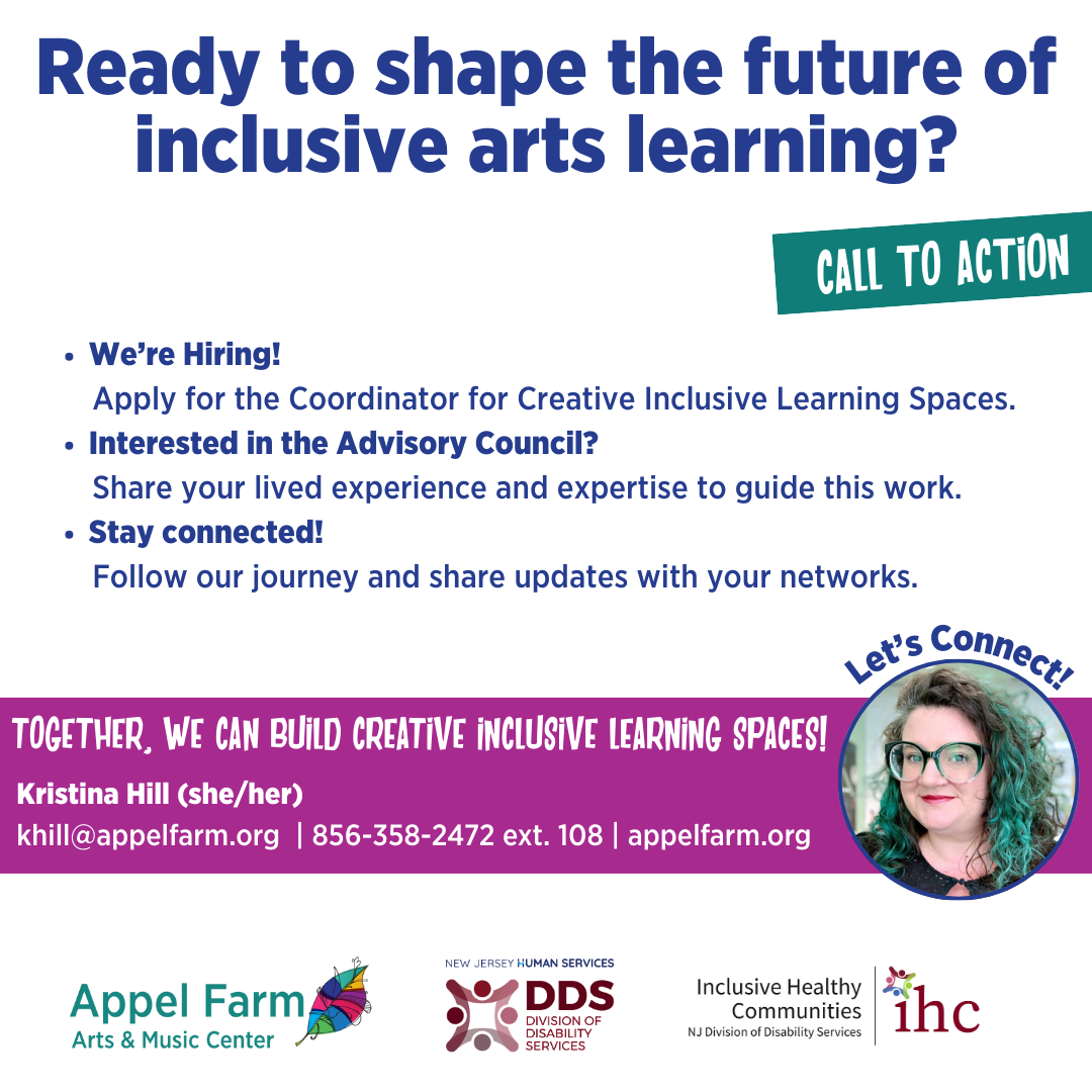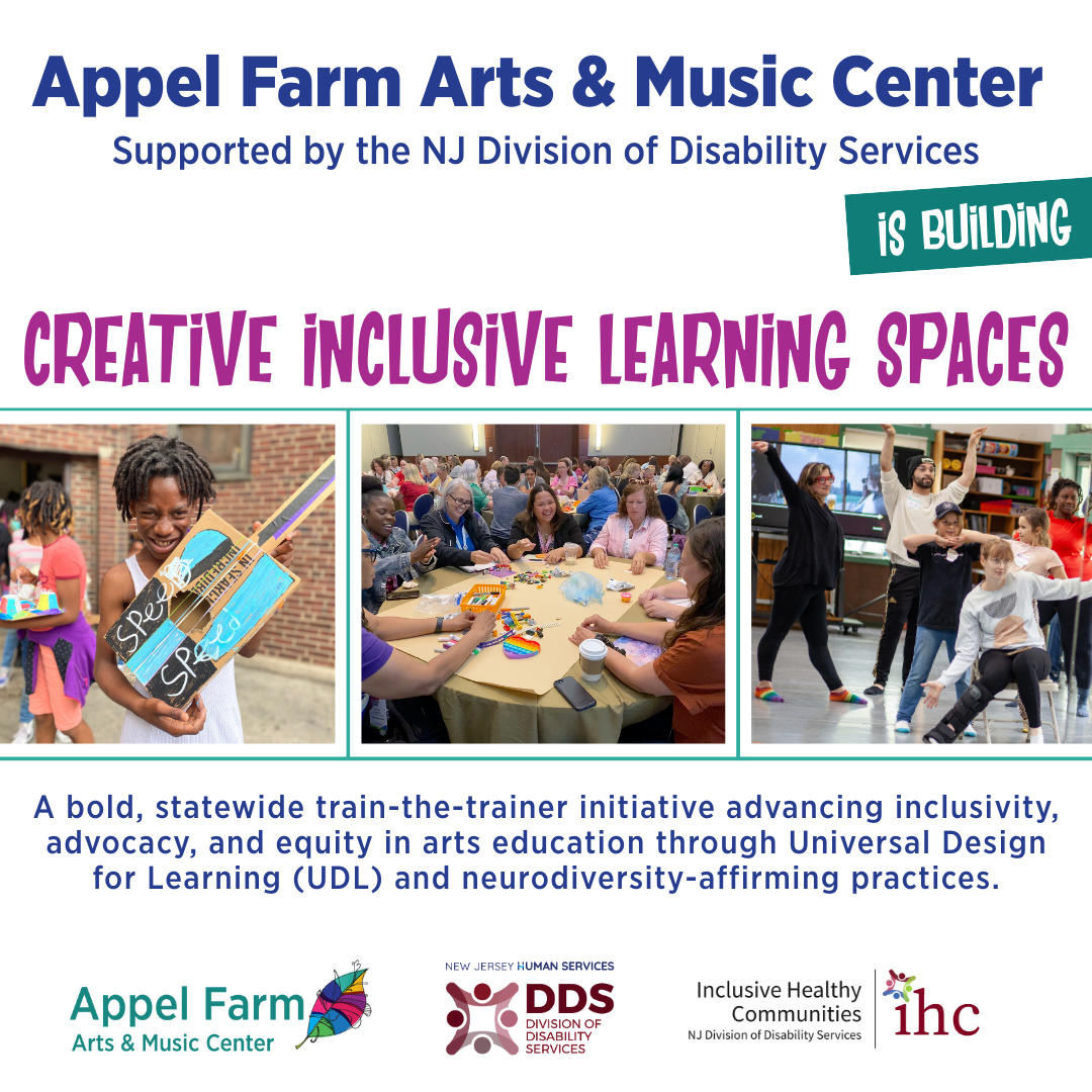 Through Inclusive Healthy Communities funding, Appel Farm is launching a two-year initiative, Building Creative Inclusive Learning Spaces: A Train-the-Trainer Initiative. This project will build statewide capacity for inclusive arts learning by preparing Appel Farm staff to train artists, educators, and community partners in creating neurodiversity- and disability-affirming environments. The initiative includes the formation of an Advisory Council of youth, educators, and community members with diverse lived experiences to guide and inform the work; the development of a comprehensive digital Resource Bank to provide ongoing support and practical tools to trainers and participants; and, in the second year, the pilot implementation of the Train-the-Trainer model in partnership with schools and community organizations.